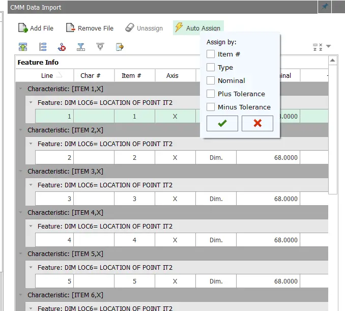 Once the file is added, use the ‘Auto Assign’ button to have Inspection attempt to map all the measurements in the CMM file to the Inspection project. You can choose one or more categories for Inspection to use, including Item #, Type, Nominal, Plus Tolerance, and Minus Tolerance. This process is crucial when you IMPORT CMM DATA IN SOLIDWORKS INSPECTION for automated mapping.