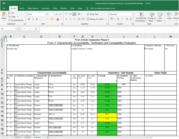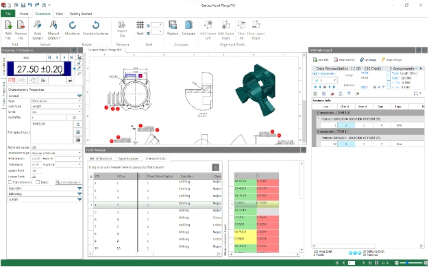 STEP3: You will see the results in the Table Manager window, complete with color coding in the table and on the dimensions in the drawing that are connected to those characteristics. Green = Pass, Yellow = Marginal Pass, Red = Fail.