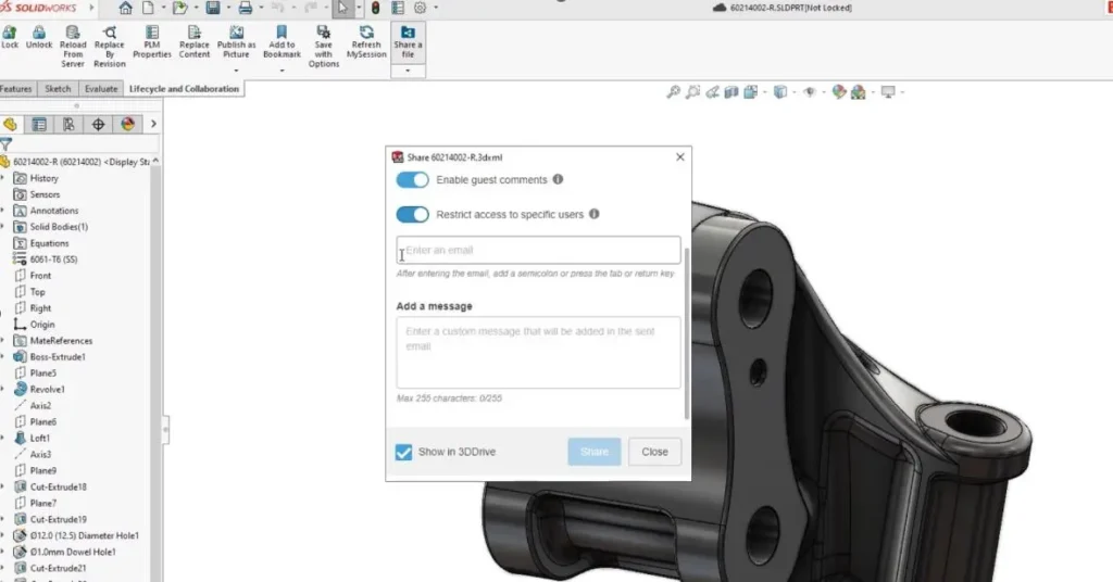 Open up your design in SOLIDWORKS and share a file from the Lifecycle and Collaboration tab.